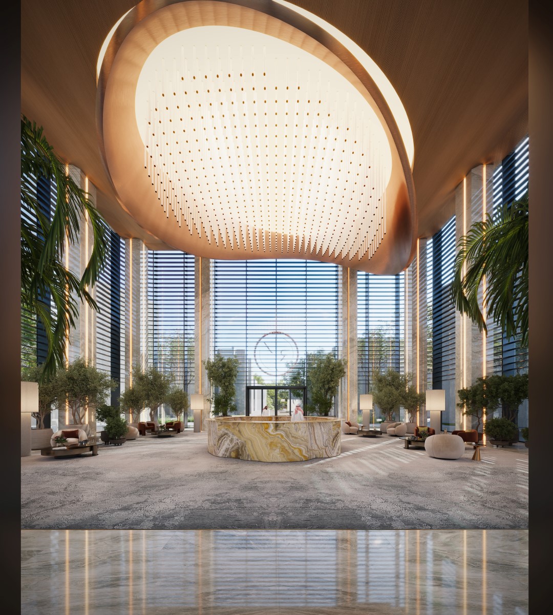 A distinctive character and design identity leave a lasting impression, with inviting interior spaces that blend openness, refined details, and luxurious furnishings. Every element is crowned by a thoughtfully planned lighting layout providing a comfortable brightness that ensures an optimal indoor mood. The signature touch of Rawajeh Holding is reflected in its grand hotel-style lobby and the elegantly furnished lounge, designed with sound-absorbing features that enhance the space’s serenity and sophistication.