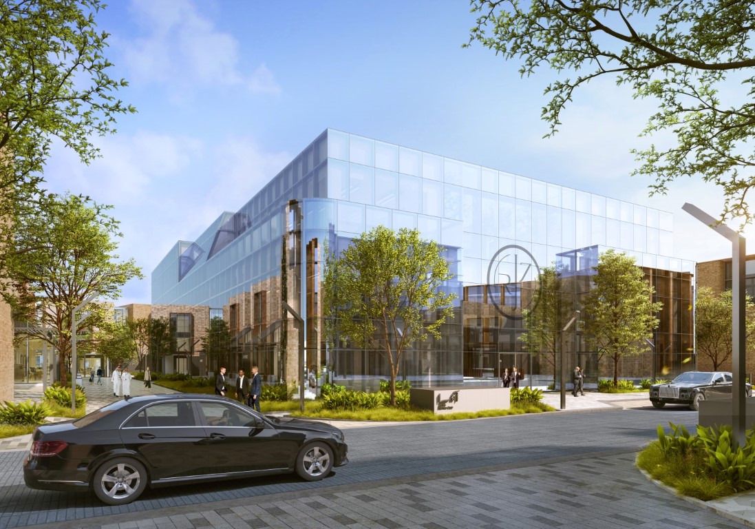 The landscape design creates both aesthetic and psychological harmony, with small gardens spread throughout the site, complemented by soft nighttime lighting and shared amenities such as a restaurant, café, and lounge all contributing to a healthy and inspiring environment for those working within the space.